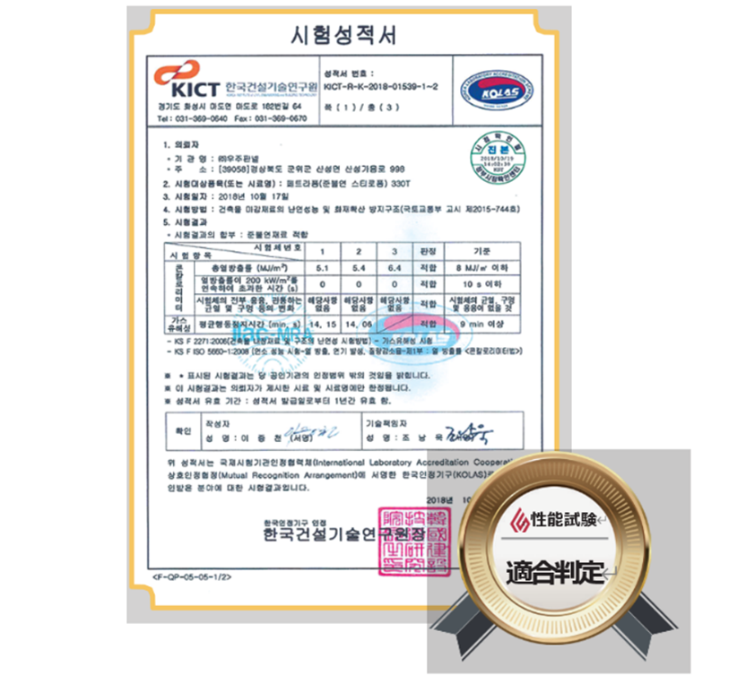 同社は330mm厚さの準不燃発泡スチロールを作り、韓国の国土海洋部(日本の国土交通省)告示第2015-744号による性能試験で適合判定<写真>を受けた。同社は以前50mm厚さの準不燃発泡スチロールを開発し話題になった事もある。テスト項目は、コンカロリーメーター試験※①とガス有害性試験である。同社の準不燃発泡スチロールは、一般発泡スチロールの原料に独自開発したペトラゾールの液体を混ぜ生産する。そのため、一般の発泡スチロール工場でも簡単な工程にて密度25㎏~30kgの最軽量準不燃発泡スチロールの生産が可能となる。