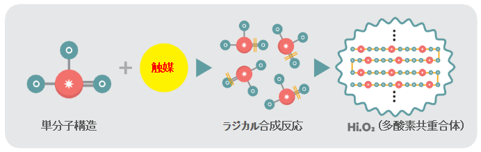 主原料である無機物に酸素を多量に含有した有機単分子物質をラジカル合成反応にて酸素分子と酸素分子を鎖で連結し作った多酸素共重合体であり、+と-の電荷を持つ酸素イオンクラスターの一種である。